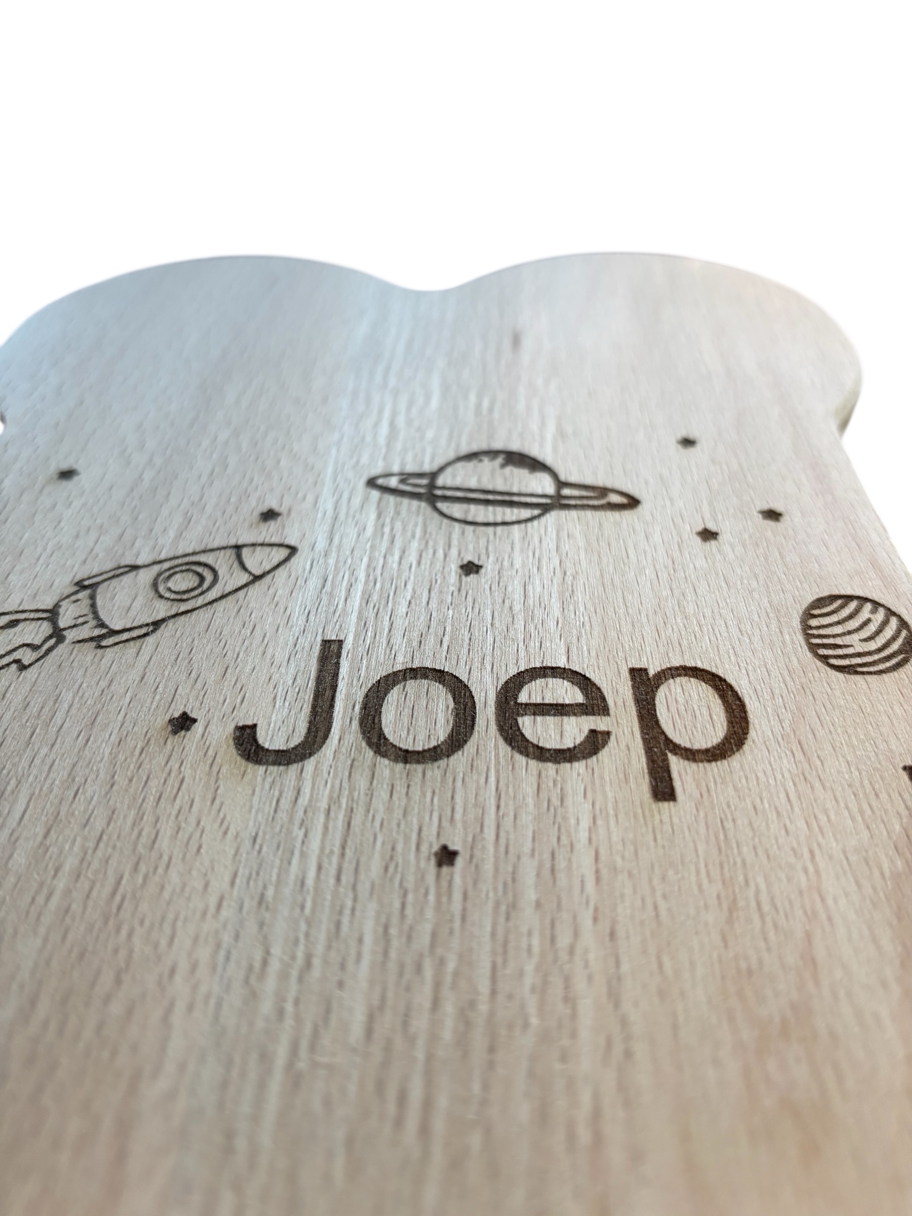 Elke plank wordt zorgvuldig vervaardigd uit duurzaam hout en heeft een eigen, uniek karakter. Je kunt het plankje laten personaliseren met een naam, datum of korte tekst — maar ook met een afbeelding. Denk bijvoorbeeld aan het ontwerp van het geboortekaartje: een silhouet, een illustratie of een symbool dat belangrijk is voor de ontvanger. Zo wordt het niet alleen een praktisch item, maar ook een blijvende herinnering.